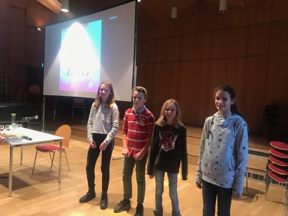 Die Zuschauer haben gerne und gebannt zugehört, wie die vier Kandidaten ihre Geschichten zum Besten gaben. Alle waren großartig. In der nächsten Runde gab es einen fremden Text, aus dem die vier vorlasen. Besonders souverän zeigte sich dabei unsere Gewinnerin des Vorlesewettbewerbs: Lina Millat aus der 6b! Herzlichen Glückwunsch an unsere Schulsiegerin und an alle Klassensieger des Vorlesewettbewerbs!